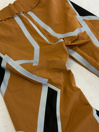 As this was my first experience constructing a backpack, I developed several prototypes to perfect the shape and structure. The final version features invisible zippers, subtly hidden within the seams of geometric panels, continuing the visual language established in the jacket and pants. While the fabric appears consistent with the garments, it is reinforced with a waterproof fused layer on the reverse side, enhancing both thickness and water resistance.