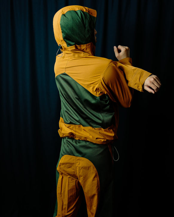 The collection primarily uses two types of fabric: yellow waterproof nylon and breathable green polyester jersey knit. The geometric design not only creates visual balance but also helps cool the body temperature. The jacket features two invisible zippers, hidden along the seam between the jersey and nylon panels. To enhance water resistance, the entire jacket is fully seam-taped, preventing moisture from seeping through.